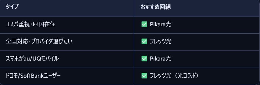 • Pikara光:四国4県(徳島・香川・愛媛・高知)に特化。地元サポートが充実。