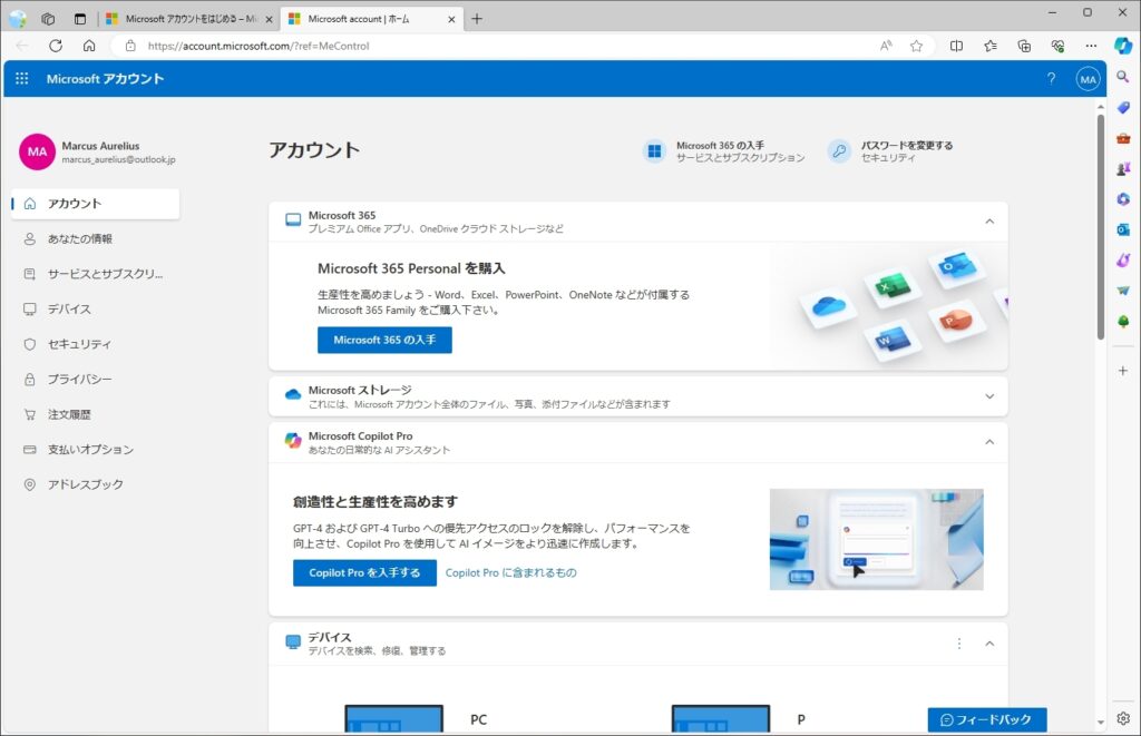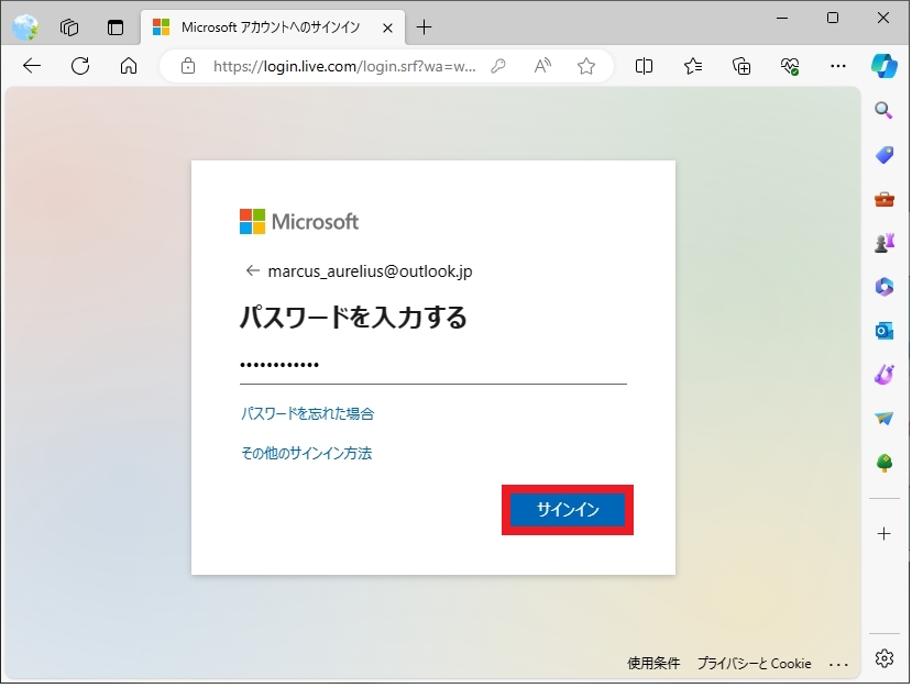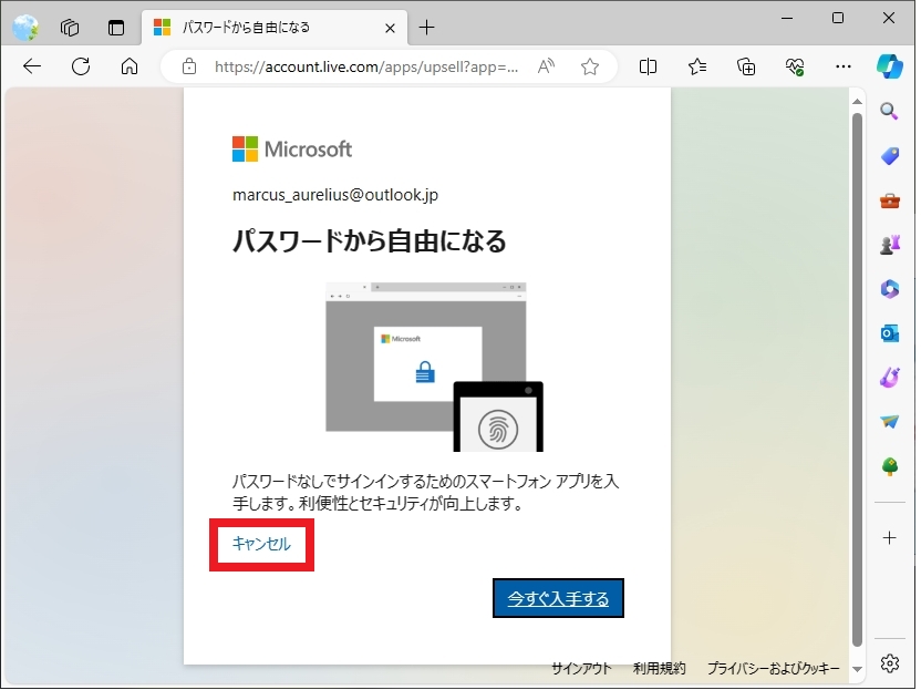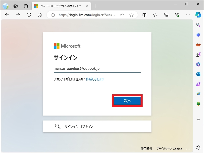 (ここではmarcus_aurelius@outlook.jpと入力しました)