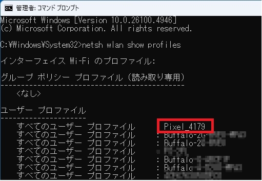 実行結果には、過去に接続したWi-Fiネットワーク名(SSID)が一覧表示される。