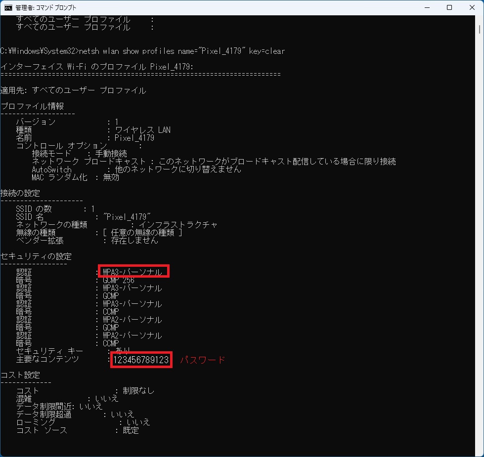 下の図が実行結果です。認証のWPA3-パーソナルと 主要なコンテンツ 123456789123 を記憶しておきましょう。主要なコンテンツとはパスワードの事です。