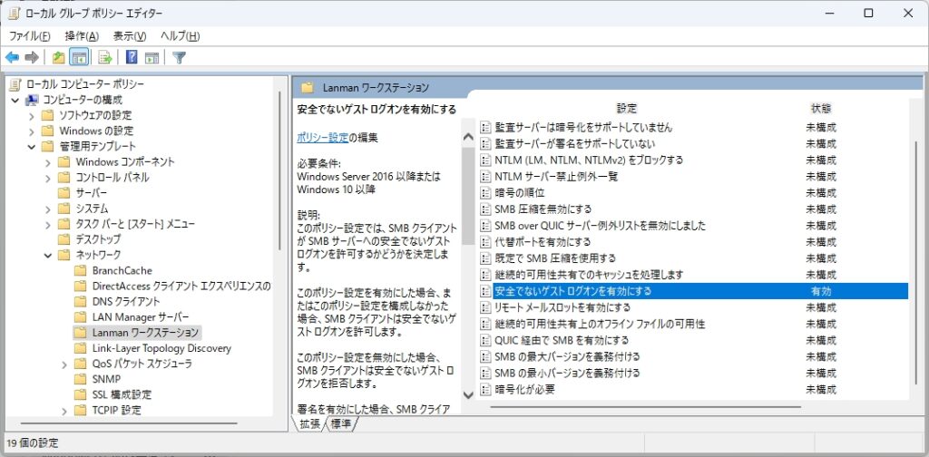 コンピューターの構成 > 管理用テンプレート > ネットワーク > Lanman ワークステーション