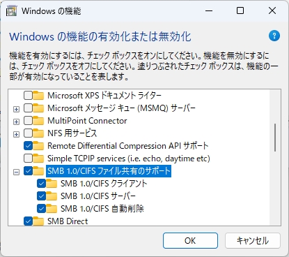 - SMB1.0が必要な場合は、Windowsの「機能の有効化と無効化」から「SMB 1.0/CIFS ファイル共有のサポート」にチェックを入れてください。